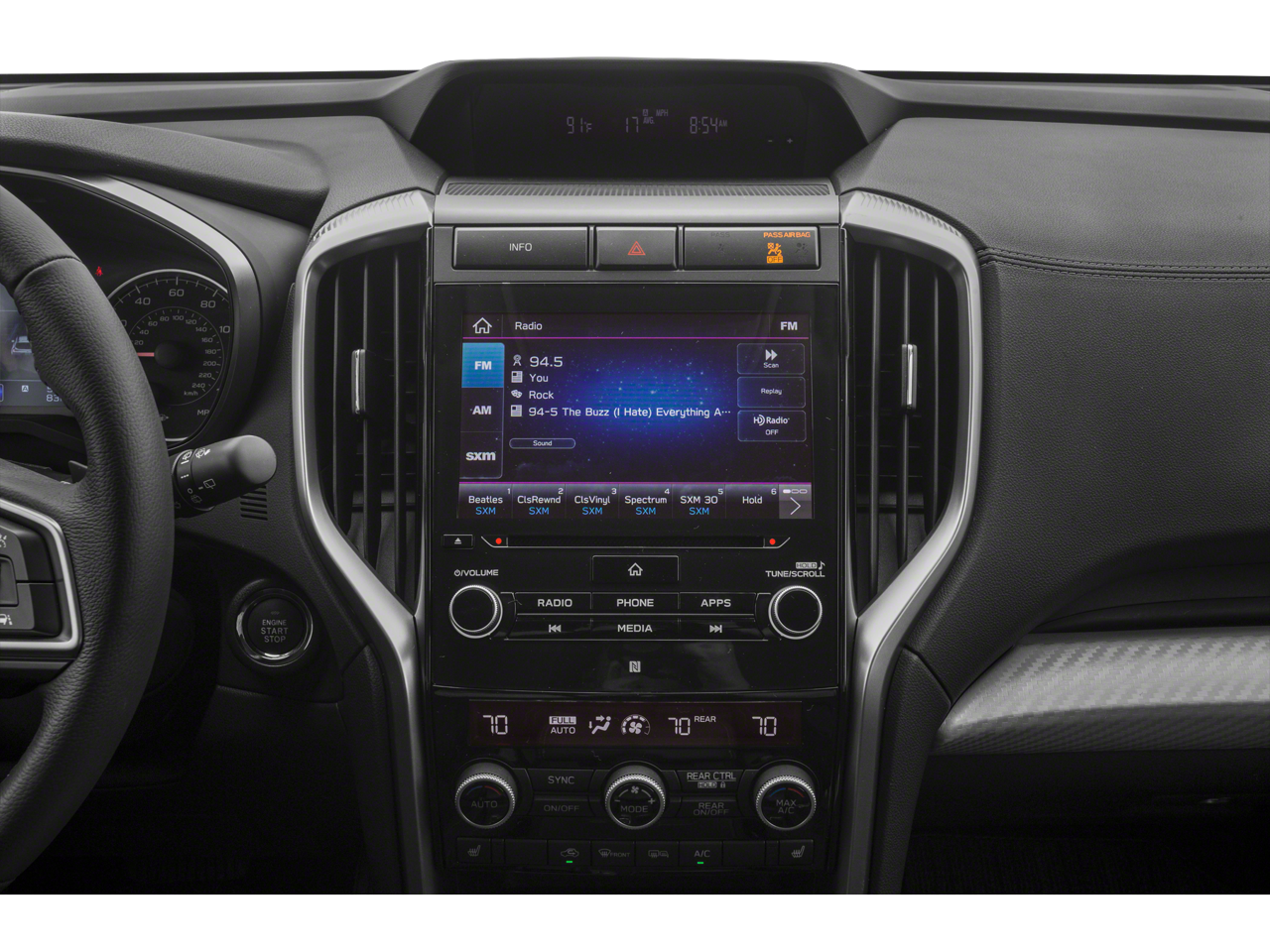 - Radio: Subaru STARLINK 8.0" Multimedia Plus System -inc: AM/FM stereo HD Radio w/single disc CD player, MP3/WMA/CRR/RW file capability, multi touch gesture high resolution LCD display screen, voice activated controls, Bluetooth audio streaming connectivity, Bluetooth hands-free phone connectivity, Bluetooth hands-free SMS text messaging connectivity (applicable w/compatible cell phone), Near Field Communication (NFC), iPod control capability, SiriusXM All Access radio (subscription required), SiriusXM Travel Link (subscription required), smartphone integration for Aha, Android Auto, CarPlay and Pandora, STARLINK cloud applications, steering wheel controls for audio and Bluetooth, 6 speakers, 3.5mm auxiliary input jack and front and rear dual USB ports