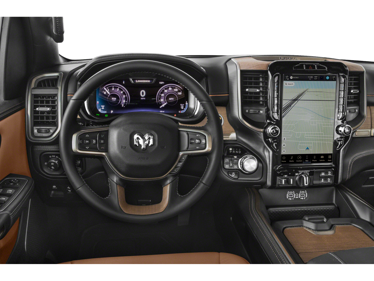 THIS VEHICLE INCLUDES THE FOLLOWING FEATURES AND OPTIONS: Body Color Bumper Group (Body Color Front Bumper and Body Color Rear Bumper w/Step Pads), Longhorn Level 1 Equipment Group (Adaptive Cruise Control w/Stop & Go, Blind Spot & Cross Path Detection, Digital Rearview Mirror, harman/kardon 19 Speaker Premium Sound, Heads-Up Display, Lane Keep Assist, LED CHMSL Lamp, MOPAR Spray In Bedliner, Parallel & Perp Park Assist w/Stop, ParkSense Front/Rear Park Assist w/Stop, Pedestrian Emergency Braking, Pick-Up Box Lighting, Power Running Boards, Surround View Camera System, Tailgate Ajar Warning Lamp, and Wireless Charging Pad), Quick Order Package 27K Longhorn, #1 Seat Foam Cushion, 10 Speakers, 3 Rear Seat Head Restraints, 3.21 Rear Axle Ratio, 4 Way Front Headrests, 4-Corner Air Suspension, 4-Wheel Disc Brakes, 48V Belt Starter Generator, ABS brakes, Adjustable pedals, Air Conditioning, Alloy wheels, AM/FM radio: SiriusXM with 360L, Apple CarPlay/Android Auto, Audio memory, Auto High-beam Headlights, Auto-dimming door mirrors, Auto-dimming Rear-View mirror, Automatic temperature control, Brake assist, Bucket Seats, Bumpers: chrome, Chrome Exterior Mirrors, Compass, Delay-off headlights, Dome Dual LED Reading Lamp, Driver door bin, Driver Seat Memory, Driver vanity mirror, Dual front impact airbags, Dual front side impact airbags, Dual-Pane Panoramic Sunroof, Electronic Stability Control, Exterior Mirrors Courtesy Lamps, Exterior Mirrors w/Heating Element, Exterior Mirrors w/Memory, Exterior Mirrors w/Supplemental Signals, Front anti-roll bar, Front Bucket Seats, Front Center Armrest w/Storage, Front dual zone A/C, Front fog lights, Front reading lights, Front Seat Back Map Pockets, Front wheel independent suspension, Full Length Premium Floor Console, Fully automatic headlights, Garage door transmitter, Genuine wood console insert, Genuine wood dashboard insert, Genuine wood door panel insert, Heated door mirrors, Heated Front Seats, Heated front seats, Heated rear seats, Heated Second Row Seats, Heated Steering Wheel, Heated steering wheel, Illuminated entry, Leather steering wheel, Leather Trimmed Bucket Seats, LED Dome/Reading Lamp, Low tire pressure warning, Memory seat, Navigation System, Occupant sensing airbag, Outside temperature display, Overhead airbag, Overhead console, Panic alarm, ParkView Rear Back-Up Camera, Passenger door bin, Passenger vanity mirror, Pedal memory, Power 4-Way Driver Lumbar Adjust, Power 4-Way Passenger Lumbar Adjust, Power 8-Way Driver & Passenger Seats, Power door mirrors, Power driver seat, Power passenger seat, Power steering, Power windows, Power-Folding Mirrors, Radio data system, Radio: Uconnect 5 Nav w/12.0 Display, Rain sensing wipers, Rear 60/40 Folding Split Recline Seat, Rear anti-roll bar, Rear seat center armrest, Rear step bumper, Rear window defroster, Remote keyless entry, Security system, Speed control, Split folding rear seat, Steering wheel mounted audio controls, Tachometer, Telescoping steering wheel, Tilt steering wheel, Traction control, Trip computer, Turn signal indicator mirrors, Variably intermittent wipers, Ventilated Front Seats, Ventilated front seats, Ventilated Rear Seats, Ventilated rear seats, Voltmeter, Wheels: 20 x 9 Aluminum Painted/Polished, and Wheels: 22 x 9 Polish/Painted w/Inserts.